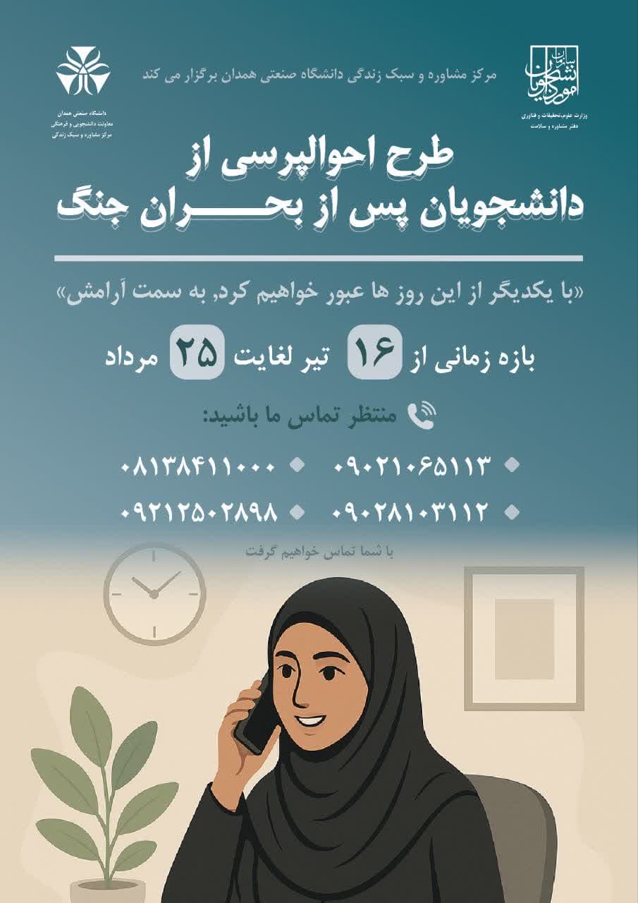 در این طرح که توسط مرکز مشاوره و سبک زندگی دانشگاه صنعتی همدان برگزار می‌شود، از ۱۶ تیر تا ۲۰ مرداد، مشاوران دانشگاه جهت بررسی حال دانشجویان با آن‌ها تماس می‌گیرند.