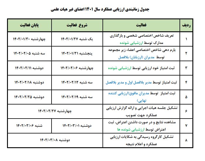 جدول زمانبندی ارزیابی عملکرد سال 1401 اعضای غیر هیات علمی